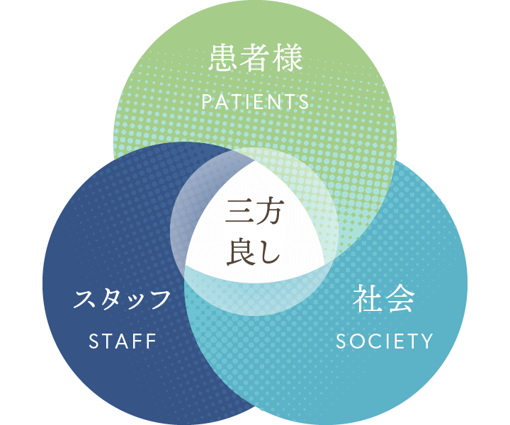 私たちは、患者様・スタッフ(=企業)・社会の三方全てが利益を得られる、トリプルウィン経営を目指しています。これは、近江商人のいう「売り手よし、買い手よし、世間よし」の三方良しの考え方に基づいています。
